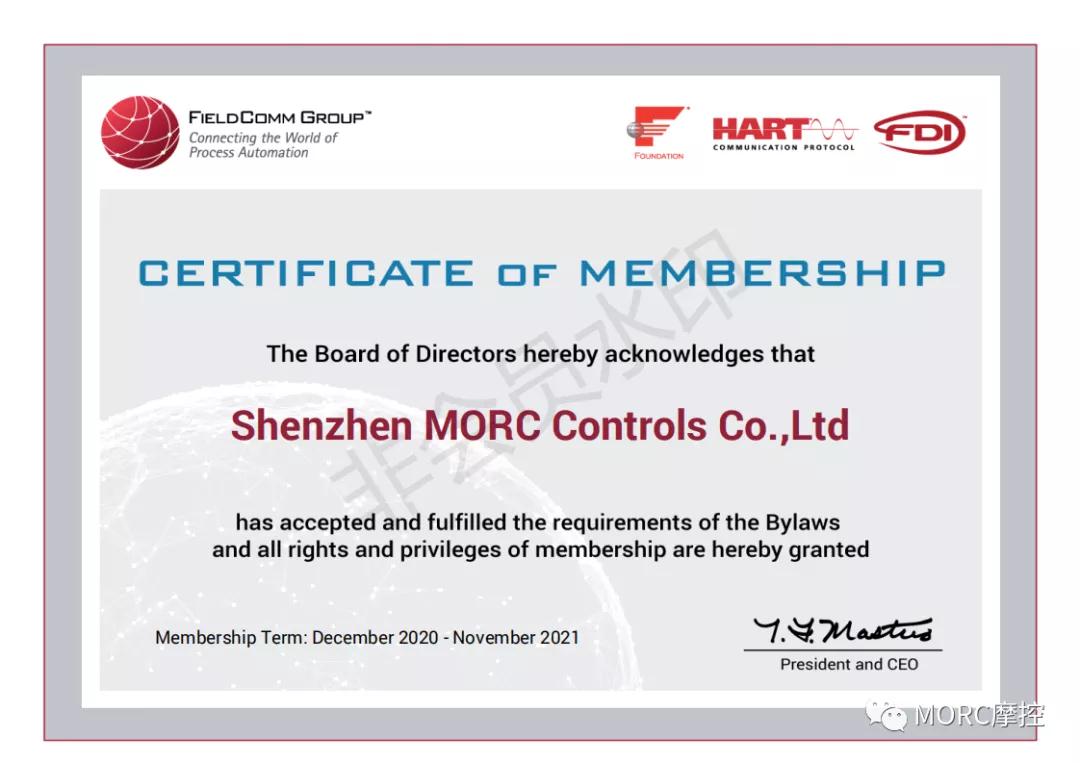 2020年12月祝賀深圳市摩控自動化設備有限公司正式加入HART 通訊基金會,成為HART通信基金會會員。